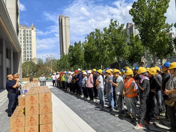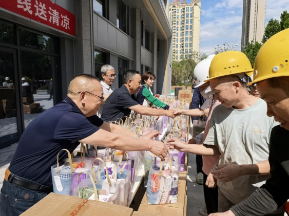 活动当日,公司经营管理班子受公司董事长鲜义恩先生委托,带队分赴各项目工地,向不畏酷暑、辛勤劳作的一线职工送上夏日清凉,致以亲切慰问。上午9:30,颐合府中心商业广场前,蒂瑞物业团队收到了公司为其精心准备的清凉礼包;11:00,空港新城丝路航际项目工地上,工人们接过公司为他们送上的解暑饮品时洋溢着感激的笑容;下午15:30,颐合苑项目南门广场前,公司领导给奋战在高温天气的工人们送上夏日清凉时,叮嘱项目负责人科学调整作息时间,保证工人身体健康,确保项目有序推进。一份份消暑物资,一句句贴心话语,让职工们在炎炎夏日感受到了暖暖爱意、阵阵清凉。